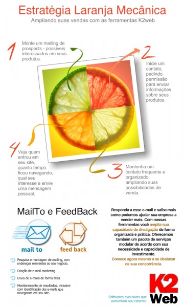 Resumimos aqui algumas dicas para conquistar novos clientes e assim, ampliar suas vendas.É uma estratégia funcional, mas que depende muito da sua dedicação.1) Verifique se seu site está bem atualizado e contém um volume de informações adequado para apresentar seus produtos, destacando os principais benefícios. Fotos de qualidade são muito importantes. Com o site bem estruturado e atualizado, passe para o passo 2.2) Se o seu site ainda não aparece nas 2 primeiras páginas do Google, você pode contratar um serviço de SEO (otimização do site para melhorar o posicionamento nos portais de busca, dos quais o mais importante hoje é o Google). Mas enquanto isso, pode começar a anúnciar no Google com anúncios pagos. A partir de R$ 10,00 por dia, você já consegue bons resultados.3) Para conseguir resultados mais rápidos é interessante realizar um trabalho de e-mail marketing.O primeiro passo é ter uma boa ferramenta de gerenciamento de mailing e envio de mensagens, com relatórios de acesso para verificar como anda o retorno da campanha. Além de uma arte bem feita e bem explicativa, você deve ter um mailing (cadastro de e-mails) de qualidade. Comece copiando seus e-mails de contato do Outlook, por exemplo. Se você tem e-mails de interessados que visitaram o seu site, esses e-mails devem ser colocados nessa ferramenta. Outra alternativa é utilizar o Kutuka, um software que pesquisa e-mail na Internet de acordo com palavras chave determinadas por você. Dessa forma você começa a montar um mailing organizado que vai possibilitar um contato frequente com esses interessados.4) Frequencia de contato. Agora que você já tem um site atualizado, já aparece no Google e realiza campanhas de e-mail marketing, vem o passo mais importante: surpreender os prospects (possíveis clientes), mantendo um contato personalizado e frequente. Para isso, utilize algumas ferramentas de organização de contatos (CRM). São ferramentas muito simples que mantém o histórico de conversas com os prospects organizado, possibilitando que sua equipe de vendas possa manter um contato personalizado, sempre sabendo o que o prospect quer ou tem interesse. Monitore quem entra em seu site e envie mensagens individuais, mostrando interesse e se comunicando com o prospect no momento certo.Esse é um pequeno resumo de uma estratégia funcional e fácil de ser implantada. A K2web possui todas as ferramentas para colocar esse estratégia em funcionamento. E oferecemos flexibilidade na contratação, com custos que se encaixam em seu orçamento. Podemos oferecer somente as ferramentas, os serviços e até o gerenciamento das ações.Informe-se com nossa área comercial.
