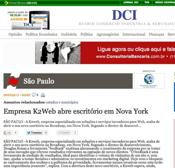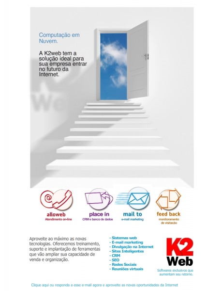 AutoPosts agora com postagem de vídeosA solução completa para aumentar a exposição de sua marca e seus produtos nas redes sociais. O Autoposts postam automaticamente no seu perfil e Fanpage do Facebook, Twitter e Linkedin. E agora permite a postagem de vídeos, aumentando sua atratividade. A K2web cria o conteúdo e posta mais de 300 posts por mês, com vídeos, fotos e conteúdo relevante para atrair mais seguidores e manter um contato frequente. E se sua empresa possui um sistema interno ou loja virtual o AutoPosts pode ser integrado para montar posts com contéudo dinâmico.Sistema de prospecção também no celularA era das vendas receptivas está acabando. Se você ainda trabalha pensando em divulgar e tirar pedidos, pode estar muito próximo de um blecaute de vendas. O Google trouxe uma infidelidade muito grande ao mercado e para manter clientes e conquistar novos leads, sua equipe de vendas precisa trabalhar de forma integrada com um CRM robusto e acessível via celular.O CRM PlaceIn é a solução ideal para sua empresa e agora possui sua versão mobile!Apareça no Google com o novo algoritmo PlaceInSEO (sigla para Search Engine Otimization) é um conjunto de ações para posicionar seu site nos buscadores. A K2web acaba de lançar um upgrade no seu programa de SEO e agora tem as ferramentas e expertise testada no Brasil e nos EUA para posicionar seu site entre os primeiros. Desde a escolha das palavras-chave, passando pelas correções e implementações até o monitoramento, o nosso serviço de SEO é o caminho certo para mostrar sua empresa no mercado.Adicione SMS à sua comunicaçãoFerramentas de e-mail marketing e SMS integradas e com uma estratégia inteligente vão trazer muito resultado para seus negócios.A K2web acaba de incorporar um sistema de SMS integrado ao CRM e ao MailTo para melhorar ainda mais a exposição de sua empresa, dentro das normas éticas e legislação no Brasil e nos EUA.